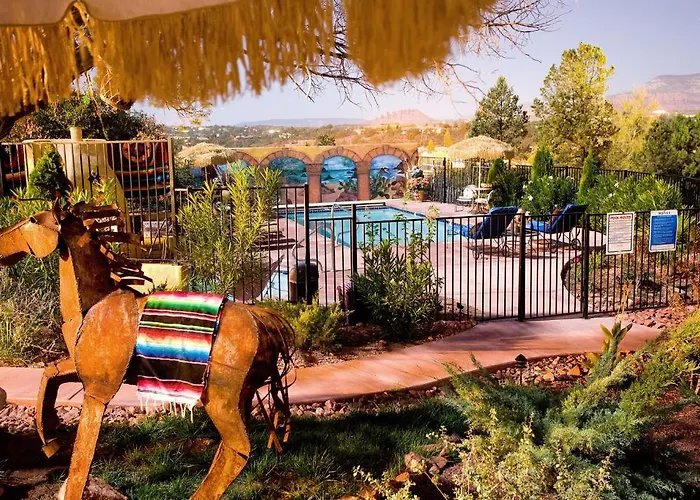A Sunset Chateau offers luxurious, artistically decorated suites with breathtaking red rock views, set on a hillside. This 5-star Sedona hotel features amenities such as a saltwater pool, jacuzzi, and lush gardens.