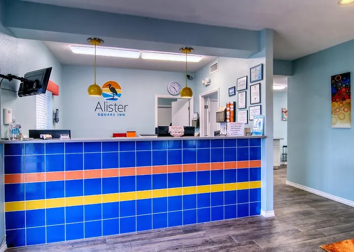 Alister Square Inn, a 3-star Port Aransas hotel with an 8.0/10 rating on Booking.com, offers an outdoor pool and year-round access to a breakfast room featuring Texas-shaped waffles and fresh fruit. This family-friendly establishment provides convenient accommodations and facilities for both families and fishermen.