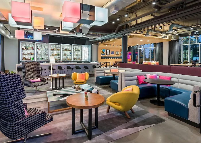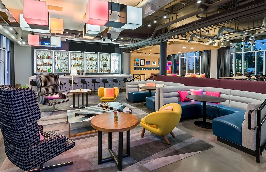 Dining options include re:fuel by Aloft, a 24/7 café for quick meals and snacks, and the W XYZ bar, known for its cocktails and a snack-attack menu. Nearby dining includes Mellow Mushroom and Outback Steakhouse, both within 0.3 miles.