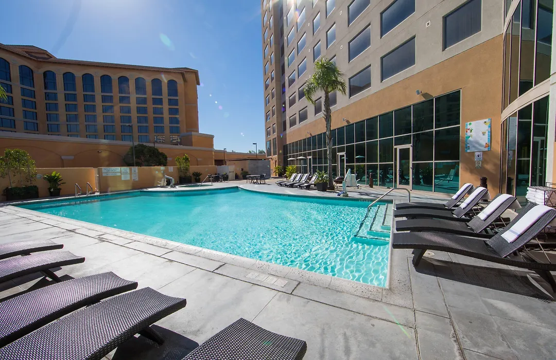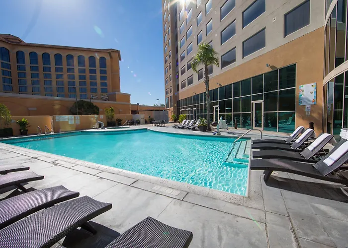 Anaheim Marriott Suites, a 3-star hotel with a 7.6/10 rating, features spacious two-room suites and a range of amenities including a fitness center and outdoor pool. This premier all-suite property offers easy access to attractions like Disneyland Resort and the Anaheim Convention Center.