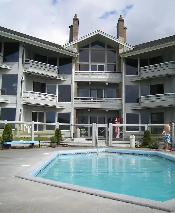 Grey Gull, an 8.9/10 rated Ocean Shores hotel, features 37 condominium-style vacation rentals, each equipped with in-room fireplaces and private balconies with west-facing views. Guests can access outdoor amenities, including a pool, spa, and BBQ grills, alongside a maintained path leading directly to the beach.