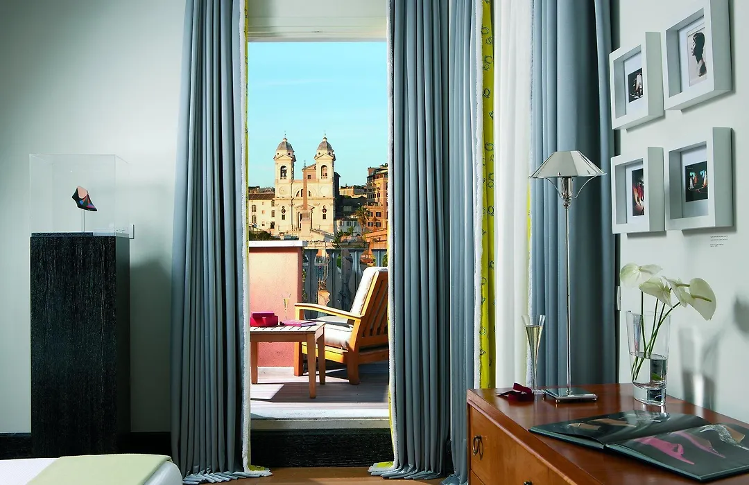 Rooms at Portrait Roma - Lungarno Collection include three splendid bedrooms with private bathrooms, two featuring private saunas. Each suite is equipped with a kitchenette, private balcony overlooking Trinità dei Monti, and luxurious amenities such as Dyson hairdryers.