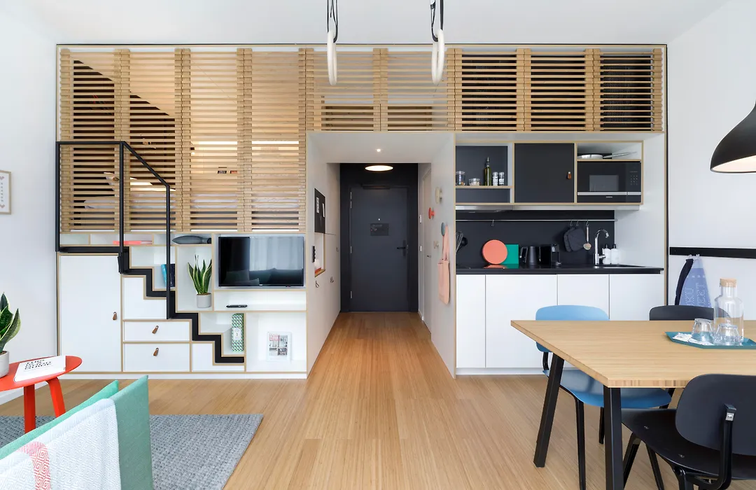 Each Zoku Loft features a flexible living space with a lofted bed, a full kitchen, and a work area designed for productivity. The modern amenities include a flat-screen TV and high-quality essentials for a comfortable stay.
