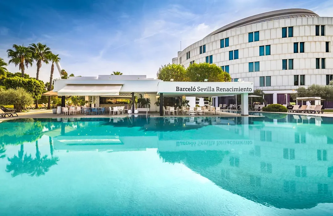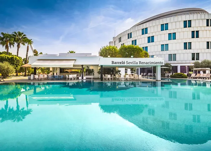 Barceló Sevilla Renacimiento, a 5-star hotel, features modern architecture reminiscent of the Guggenheim Museum in New York. The establishment includes four restaurants, a fitness room, and a heated outdoor swimming pool. It is the official hotel of Isla Mágica theme park, providing unique experiences for families.