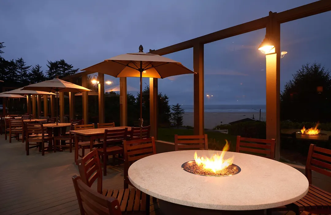 Dining is available at the Sea Glass Bistro & Lounge, offering coastal cuisine and a variety of cocktails, wine, and beer with ocean views. An outdoor dining area features fire tables, providing a unique setting for meals.