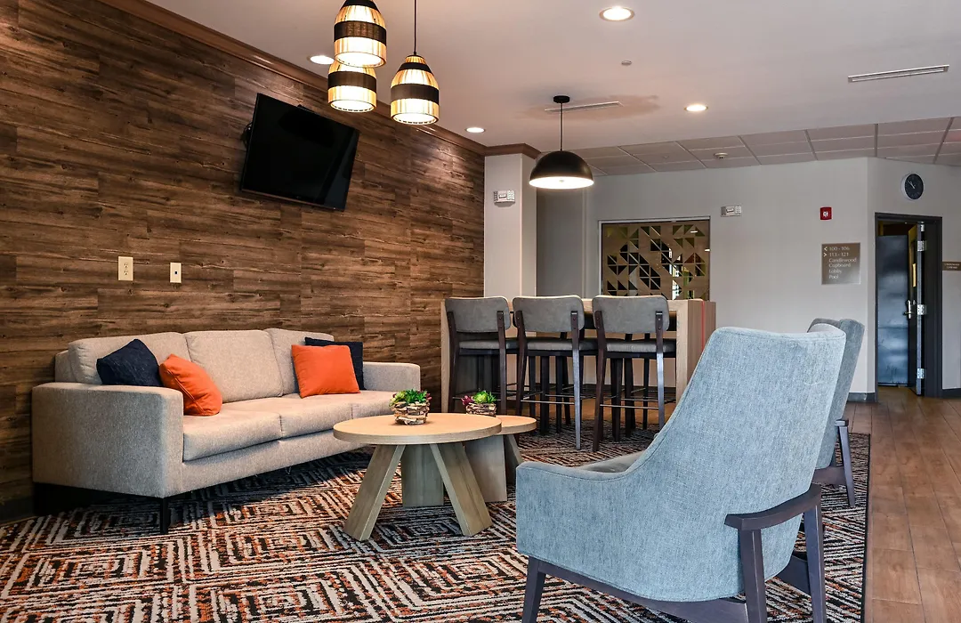 Rooms at Candlewood Suites Champaign-Urbana University Area are designed for extended stays, including a full kitchen with a refrigerator, dishwasher, and necessary cookware. Each unit also features a 32-inch flat-screen TV and spacious seating areas, providing comforts of home during your stay.