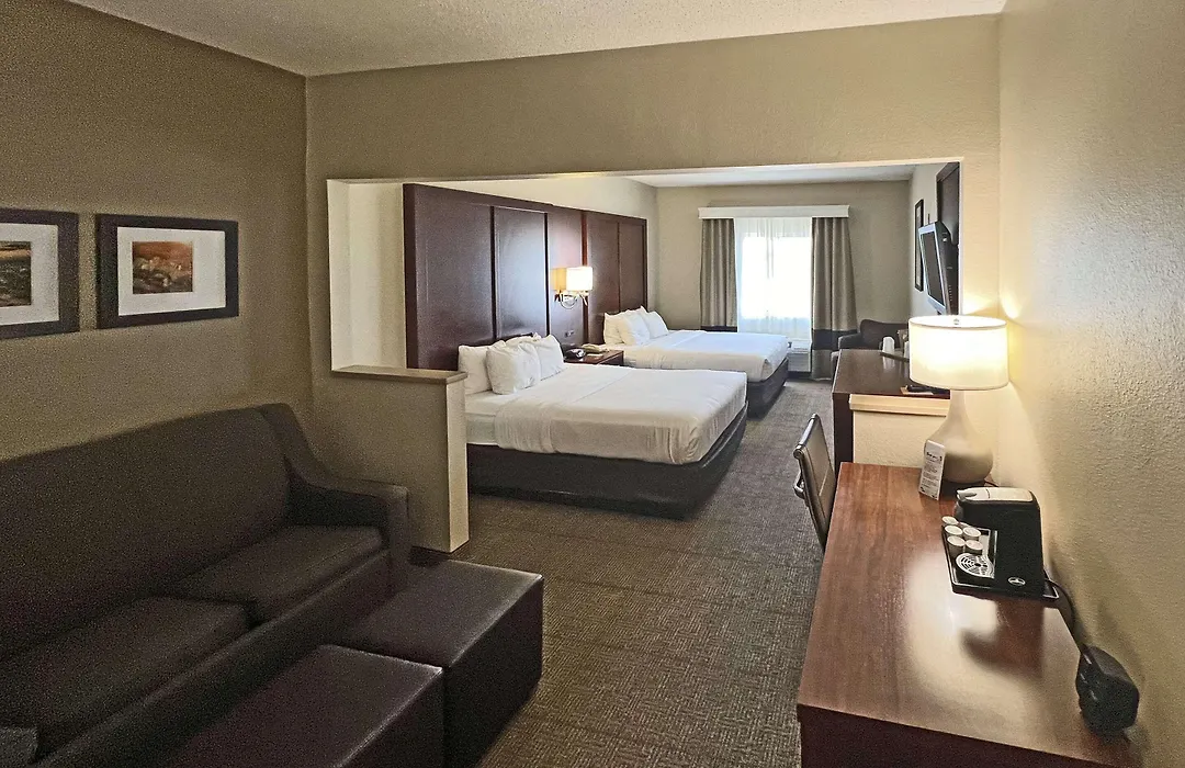 Spacious suites at Comfort Suites include premium bedding, flat-screen TVs, sofa beds, microwaves, and refrigerators. Free WiFi and laundry facilities are available on the premises for guest convenience.