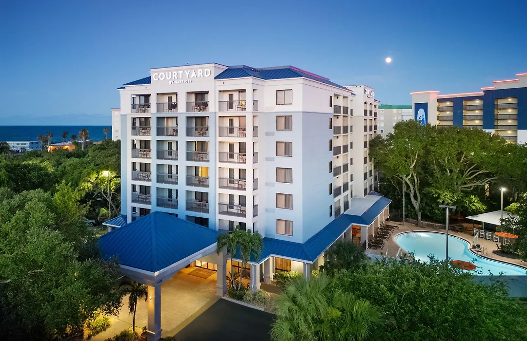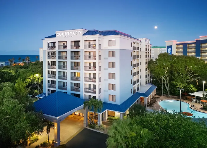 Courtyard By Marriott Cocoa Beach Cape Canaveral, a 3-star Cocoa Beach hotel with an 8.5/10 Booking.com rating, offers direct beachside access to the Atlantic Ocean and is minutes from Port Canaveral. It features a state-of-the-art lobby, outdoor pool, and a fitness center, providing an array of amenities for both leisure and business travelers.