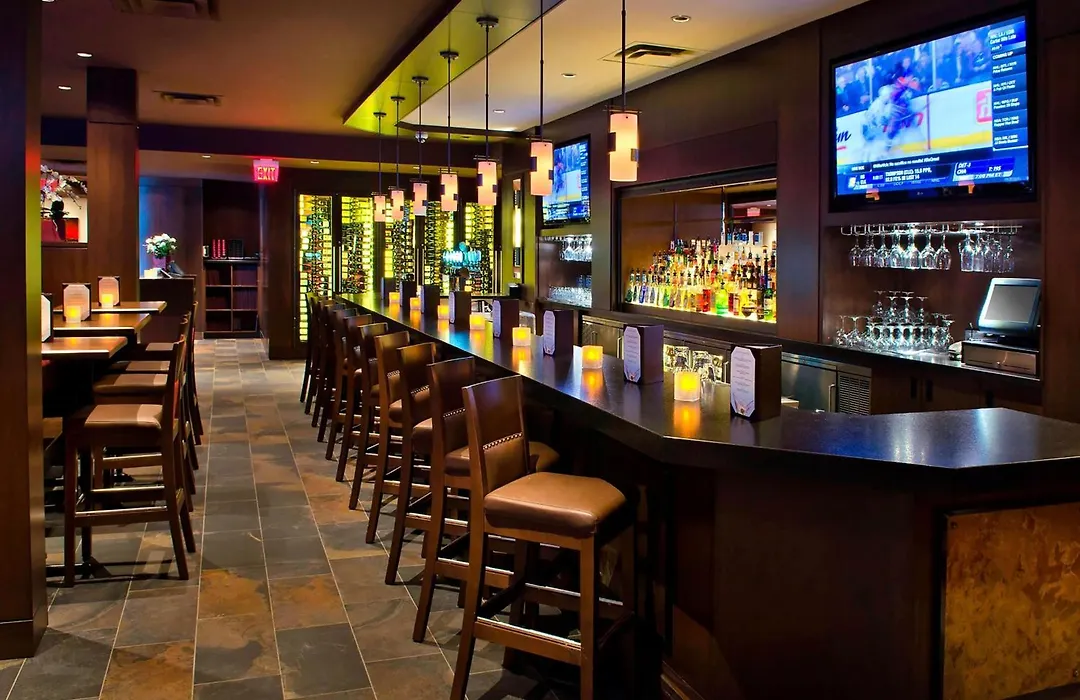 Dining options include The Keg Steakhouse & Bar, known for flavorful steaks and fresh seafood, and TGI Friday's located across the parking lot. Guests can also find a 24-hour market shop for snacks and drinks.