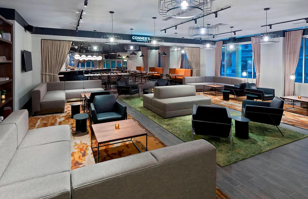 Dining options include Conner's Kitchen +Bar, where guests can enjoy breakfast, lunch, and dinner featuring elevated comfort food and crafted cocktails. The hotel's outdoor patio includes a fire pit for additional seating.
