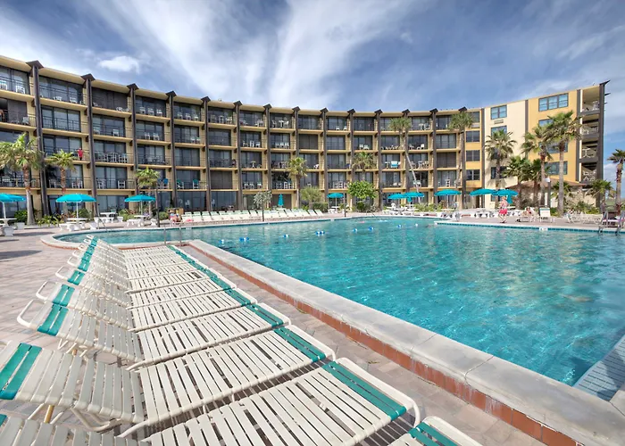 Daytona Beach Hawaiian Inn, a 2-star beachfront resort, features spacious suites with private balconies and an Olympic-sized swimming pool. The hotel offers amenities including a Tiki Bar serving cocktails and a game room for entertainment.