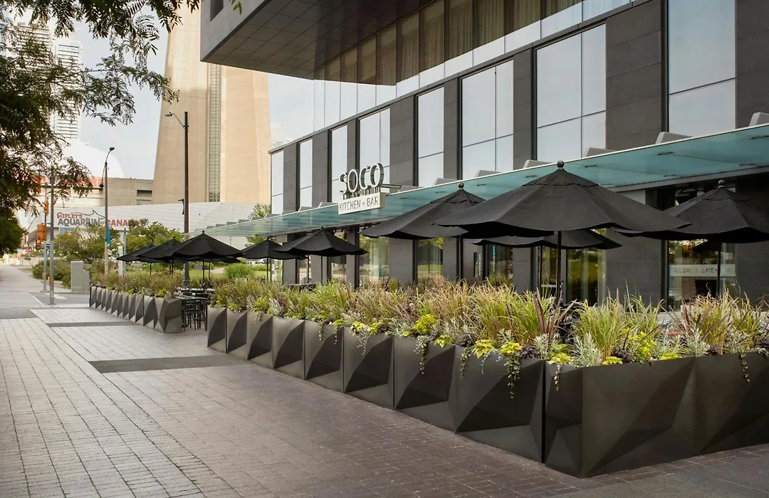 SOCO Kitchen + Bar serves upscale casual dining with a menu featuring pizzas and steak. For drinks, Char No.5 offers a speakeasy feel with premium cocktails. The Roof at SOCO provides outdoor seating for cocktails and light snacks alongside city views.