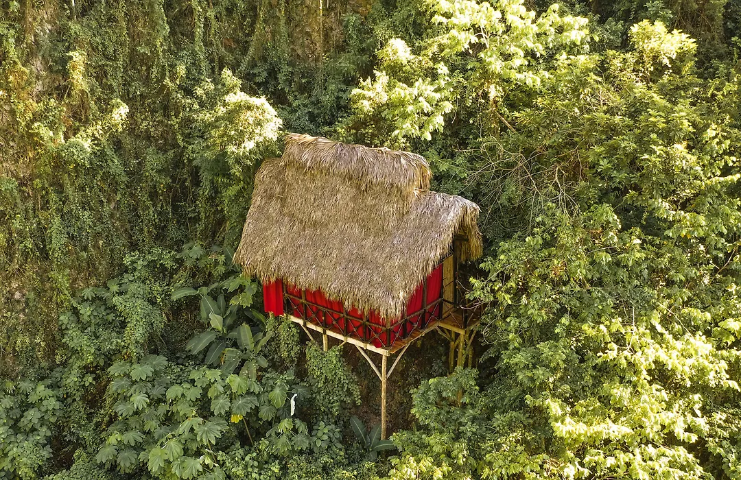 Guests at Dominican Tree House Village enjoy treehouse-style rooms, each with a private bathroom and additional amenities like a cold water shower, sink, and toilet. The open-air design allows for natural immersion, complemented by rope bridges connecting the cabins to various facilities.