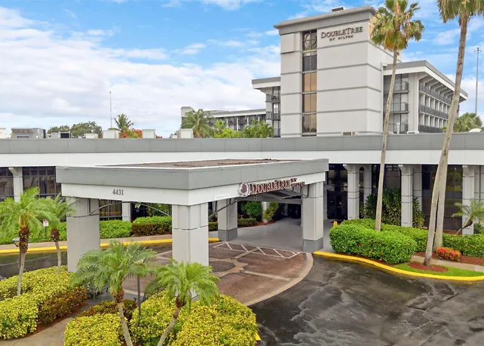 DoubleTree By Hilton Palm Beach Gardens, a 4-star hotel rated 7.7/10 on Booking.com, features an outdoor pool and an on-site restaurant. Pets are not allowed, and the hotel offers complimentary WiFi and EV charging stations.