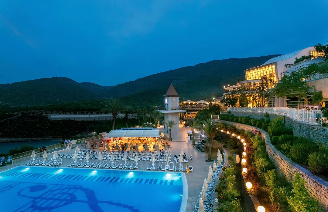 Duja Bodrum, a 5-star Torba hotel with an 8.1/10 rating on Booking.com, features four outdoor and three indoor pools, a fitness center, and a comprehensive spa offering wellness treatments. Dining options include a buffet-style restaurant and four specialty restaurants serving Turkish, Chinese, Italian, and seafood cuisine.
