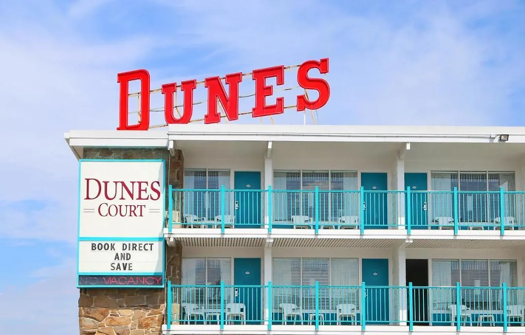 Dunes Court, a 2-star Ocean City hotel rated 8.1/10 on Booking.com, offers spacious accommodations and an outdoor pool. The 1960s coastal vibe meets modern comforts, making it a great choice for families and friends looking for an affordable beach vacation.