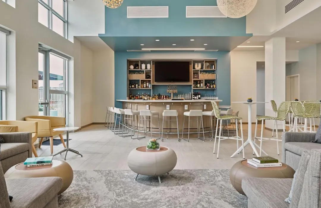 Guests can unwind at the sun terrace with a saltwater pool, outdoor grill, and cornhole setup. The fitness center is open 24 hours and features various cardiovascular equipment.