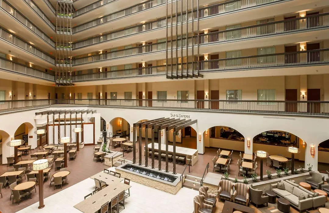 All rooms at Embassy Suites are spacious two-room suites equipped with air conditioning, flat-screen TVs, and private bathrooms featuring designer toiletries. Guests will also find amenities like microwaves, refrigerators, and Wi-Fi, which include premium bedding and garden baths in select rooms.