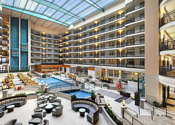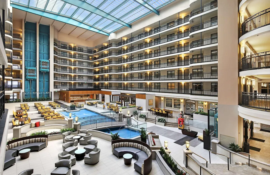Leisure facilities at Embassy Suites include an indoor pool, sundeck, and fitness center. The hotel is pet-friendly, accommodating guests traveling with pets and offering recreational opportunities.