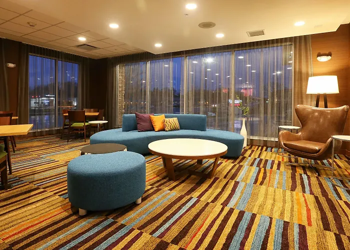 Each guest room at Fairfield Inn & Suites by Marriott Madison Verona includes air conditioning, a cable TV with satellite channels, a desk, microwave, and refrigerator. The hotel has a vibrant lobby for relaxation and work.
