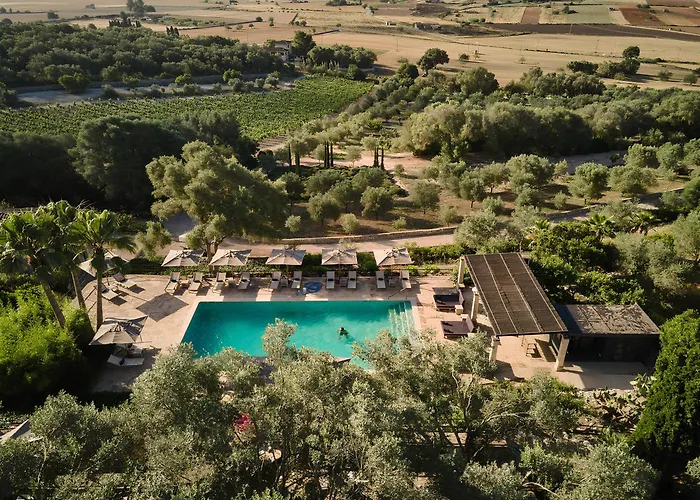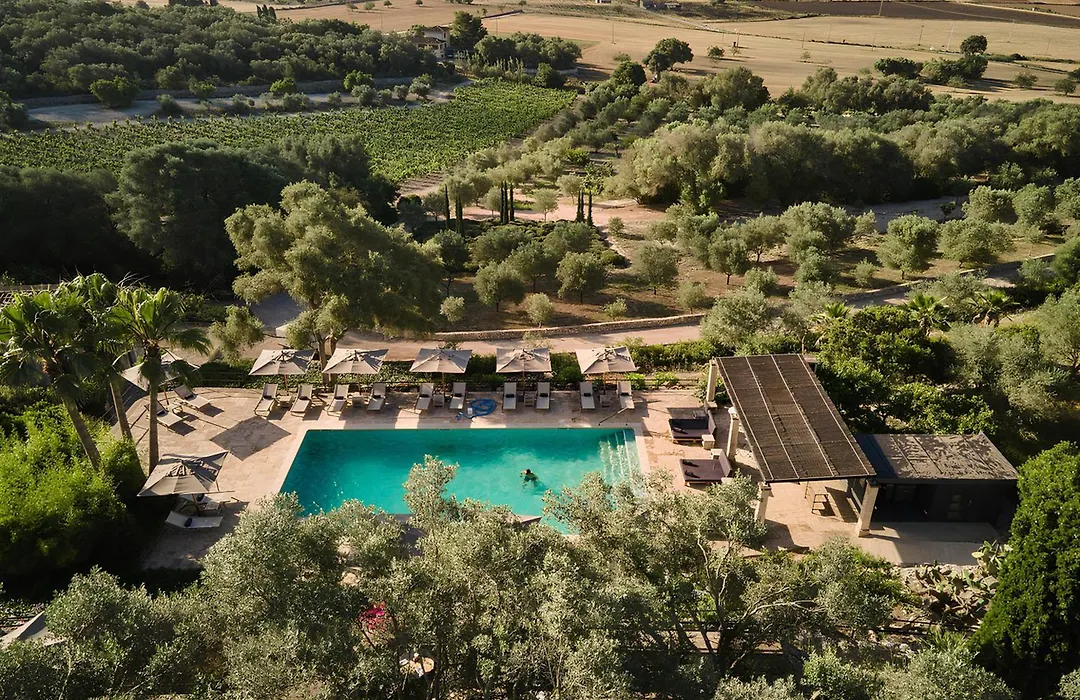 Finca Serena Mallorca, Small Luxury Hotels is a 5-star, adults-only haven set across a 99 acre estate featuring a large aquamarine pool, extensive wellness facilities, and Jacaranda restaurant led by a Michelin-starred chef. Guests can experience outdoor yoga sessions, vineyard tours, and a serene ambiance punctuated by lavender fields.