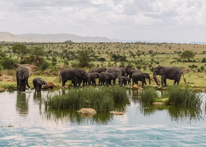 Four Seasons Safari Lodge Serengeti offers a luxurious 5-star experience with a 9.7/10 rating on Booking.com. The lodge features spacious accommodations with private balconies and direct views of wildlife, world-class amenities including an infinity pool and a luxurious spa. Family-friendly features include creative children's programs and exciting guided adventures.