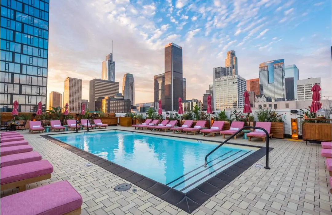Freehand Los Angeles, rated 8.0/10 on Booking.com, is a 4-star hotel located in the historic Commercial Exchange building featuring premium rooms, suites, and shared accommodations. Notable amenities include a rooftop pool, award-winning Broken Shaker bar, and the eclectic menu at The Exchange restaurant, which explores multicultural culinary influences.