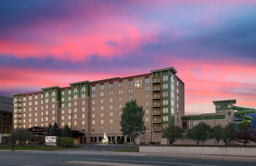 Great Wolf Lodge Bloomington, a 4-star family-friendly resort, features an expansive indoor water park maintained at a warm 84 degrees year-round, offering guests fun experiences under one roof. The resort includes various dining options, unique attractions, and accommodations designed for family gatherings.