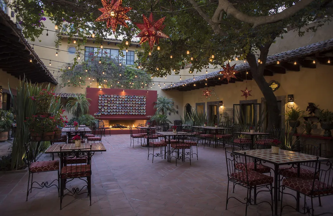 Dining options at Hacienda El Santuario include 'La Samaritana' aguas frescas juice bar and 'La Sanmiguelada' restaurant, which serves both typical and international dishes. Guests can also enjoy refreshments at the flower-filled courtyard, featuring black metalwork tables amidst vibrant plant life. Nearby dining options include Luna Rooftop Tapas Bar and Moxi Restaurant.