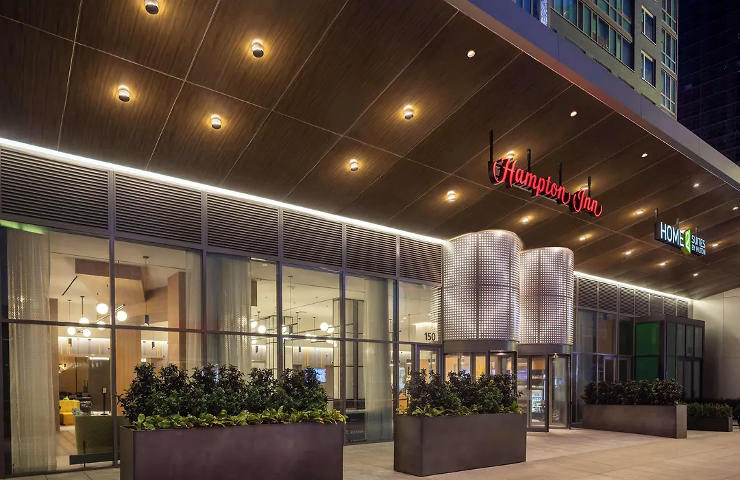 Dining options include a complimentary breakfast and local restaurants within walking distance such as Carmine's Italian Restaurant, Hard Rock Cafe, and Olive Garden, each located 0.3 miles from the hotel.