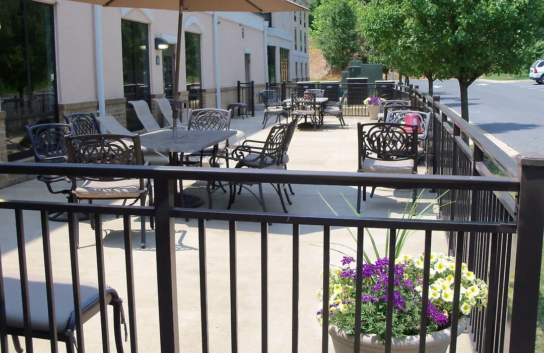 A complimentary hot breakfast is served daily, featuring items like eggs, bacon, and cinnamon rolls. Breakfast can be enjoyed in the sunny breakfast area or on the charming patio.