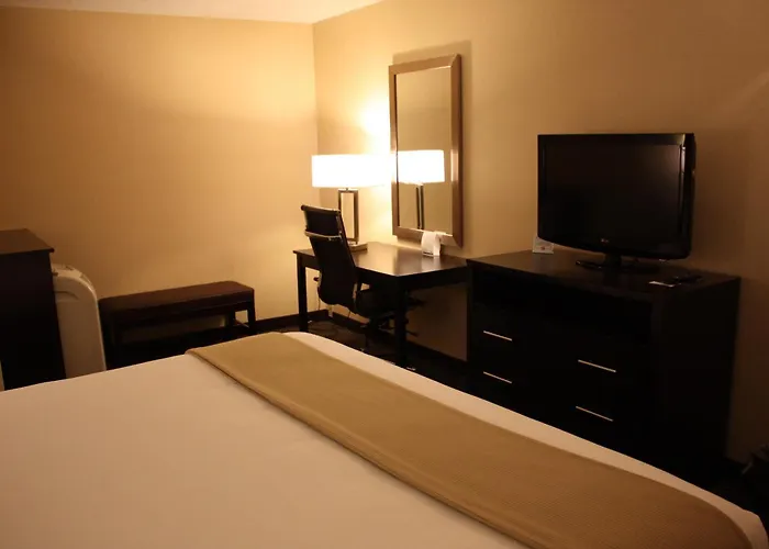 Rooms at Holiday Inn Express include essentials such as a mini-fridge, microwave, and flat-screen TV. Accessible rooms feature roll-in showers with benches and hand-held sprayers, accommodating various needs.