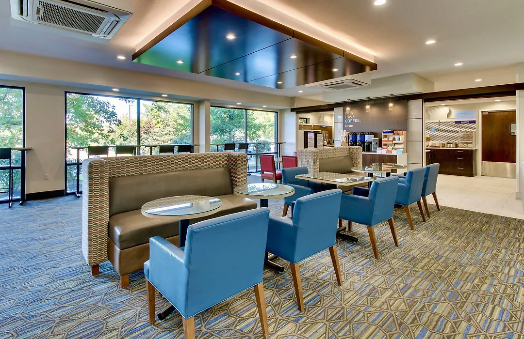 The hotel serves a complimentary Smart Start breakfast, including scrambled eggs, bacon, and pancakes seven days a week. Nearby dining options include Charlie Browns Steakhouse and Red Line Diner, both within a 0.3 miles walk.
