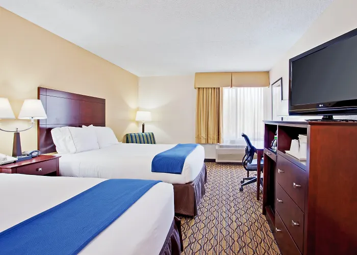 Holiday Inn Express features spacious rooms with options for one king or two queen beds, high-speed wireless Internet, a refrigerator, and a 37" flat-screen TV. Each room also includes a coffeemaker, hair dryer, and an iron and ironing board, ensuring guests have all essentials for a comfortable stay.
