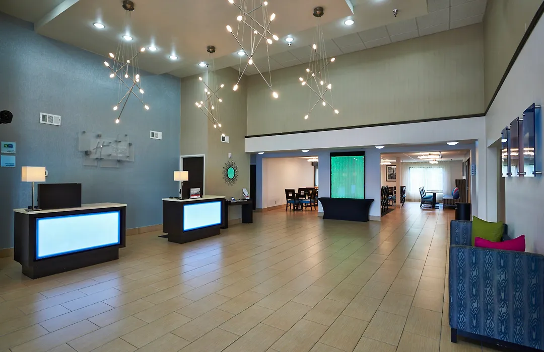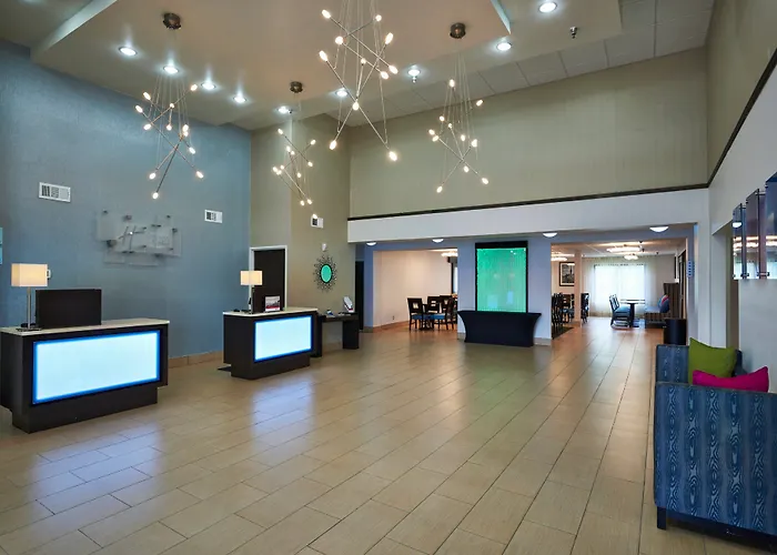 The Holiday Inn Express & Suites Birmingham South - Pelham is a 3-star hotel with an 8.6/10 rating on Booking.com. This hotel offers amenities including a heated indoor pool and a complimentary Express Start Breakfast bar. It is adjacent to the Verizon Wireless Amphitheater and North of Oak Mountain State Park, ideal for outdoor activities.