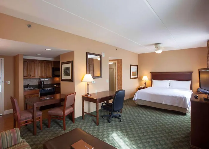 Rooms at Homewood Suites are designed for comfort, featuring air-conditioning and separate living areas with sofa beds. Each suite includes a fully equipped kitchen, refrigerator, microwave, and two flat-screen cable TVs.