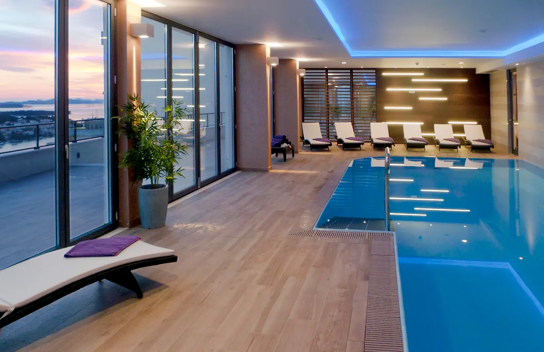 Leisure facilities at Hotel Adria include indoor and outdoor swimming pools, a hot tub, and a spa offering massages and body treatments. The hotel's fitness area is equipped for guests to maintain their routines during their stay.