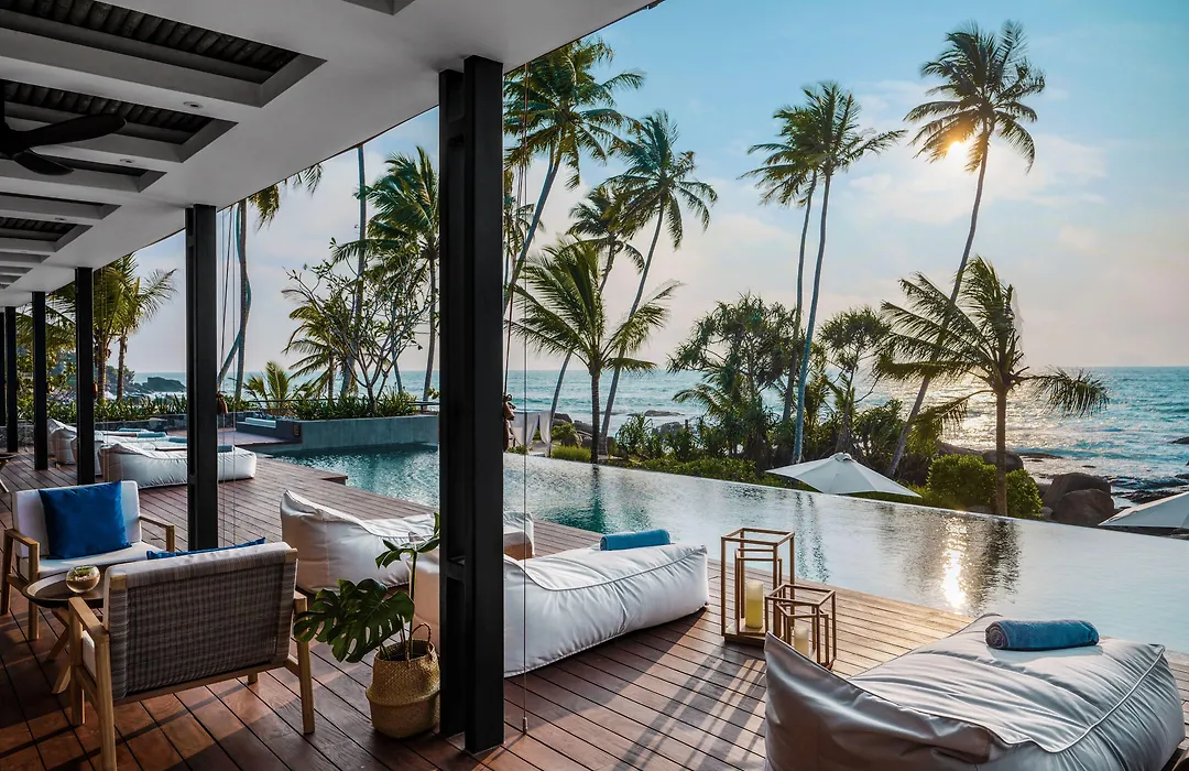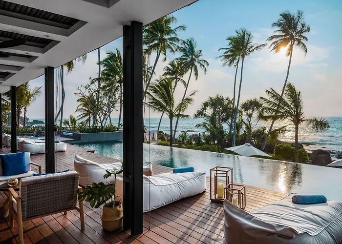 Ahu Bay, a 5-star Ahungalla hotel rated 9.2/10 on Booking.com, features contemporary beach houses with panoramic ocean views and direct beach access. Guests enjoy amenities such as an outdoor swimming pool, free WiFi, and a bar on site.