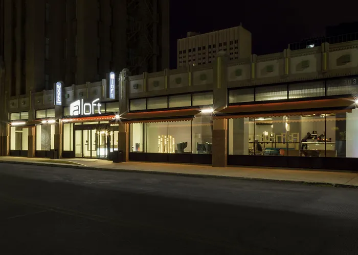 Aloft El Paso Downtown offers business facilities including 4000 square feet of conference space and meeting rooms, making it suitable for events. The hotel features accessible routes to all main areas and welcomes service animals. Nearby public transportation includes the Arts District bus stop, a 9-minute walk away.