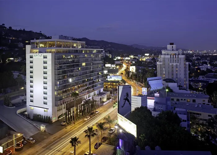 Andaz West Hollywood, By Hyatt is a 4-star hotel featuring a rooftop pool with views of the Sunset Strip. Amenities include complimentary coffee and pastries in the lobby, and a well-equipped gym. The hotel's location features significant design elements and historical references.