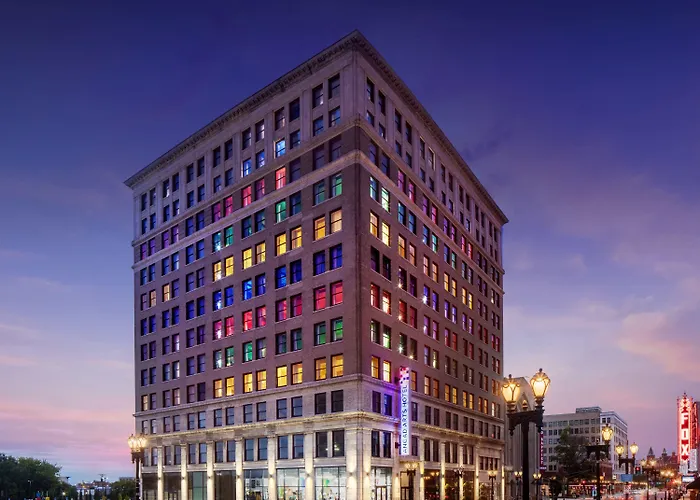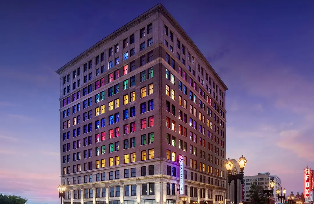 Angad Arts Hotel St. Louis, Tapestry Collection By Hilton is a 5-star hotel featuring a unique local art experience throughout the property. Guests can enjoy amenities including an outdoor rooftop terrace, a library with skyline views, and a private ballroom, all situated in the Grand Center Arts District.