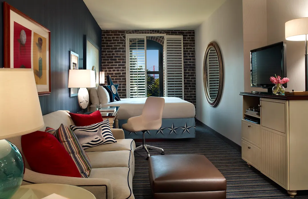Guest rooms at Argonaut Hotel reflect the rich history of the restored Haslett Warehouse, featuring nautical decor and modern conveniences. Each room includes views of the San Francisco Bay, Alcatraz, or the Golden Gate Bridge, along with amenities such as a flat-screen TV and a mini-fridge.