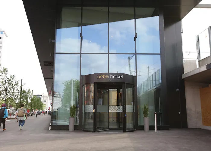 Arte Hotel Salzburg is a contemporary 4-star hotel with a rating of 8.6/10 on Booking.com, featuring panoramic city views and a rooftop bar. The hotel has a small spa area and offers SkyBREAKFAST on the 15th floor. The impressive steel and glass structure is located close to the main train station.