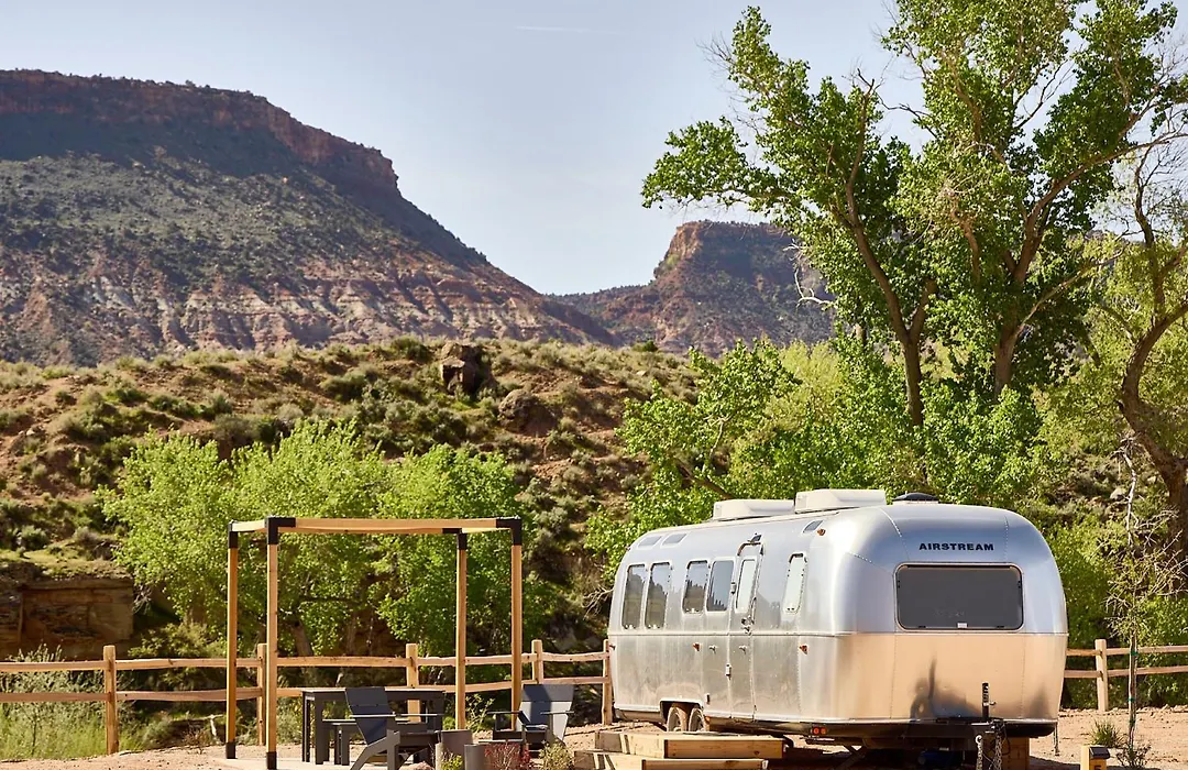Accommodations at Autocamp Zion include Airstream suites equipped with a kitchenette, flat-screen TV, and luxury bath products. The camp also features canvas tent options that can accommodate groups of up to six, ideal for families.