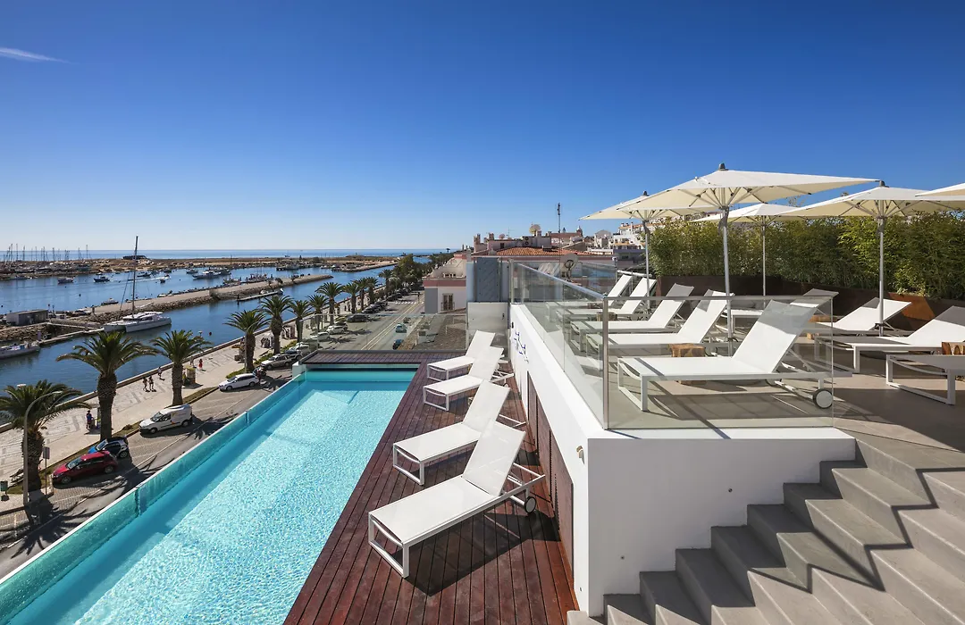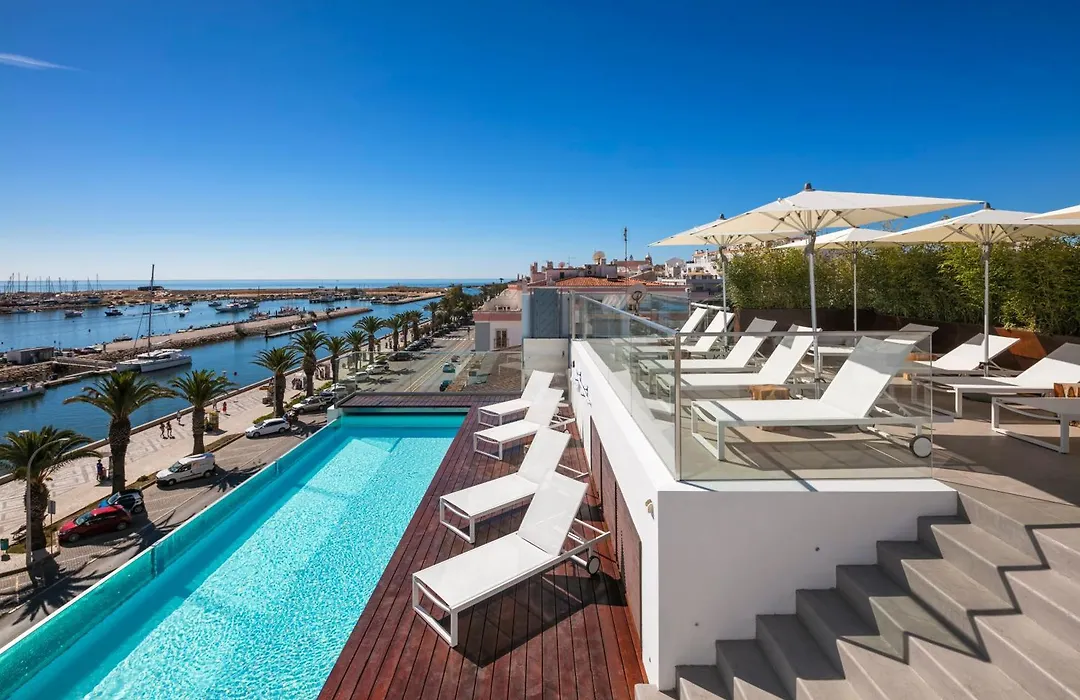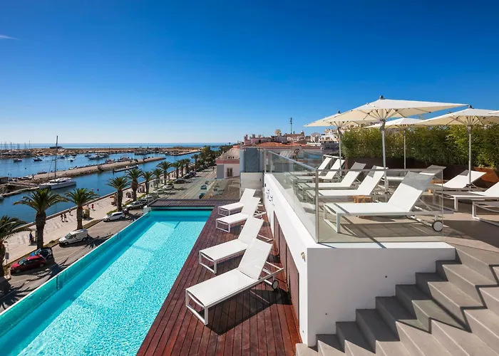 Lagos Avenida Hotel (Adults Only), a 4-star property rated 9.0/10 on Booking.com, features modern accommodations with balconies or terraces offering views of the Marina de Lagos and the sea. The hotel includes an outdoor infinity pool and a rooftop terrace.