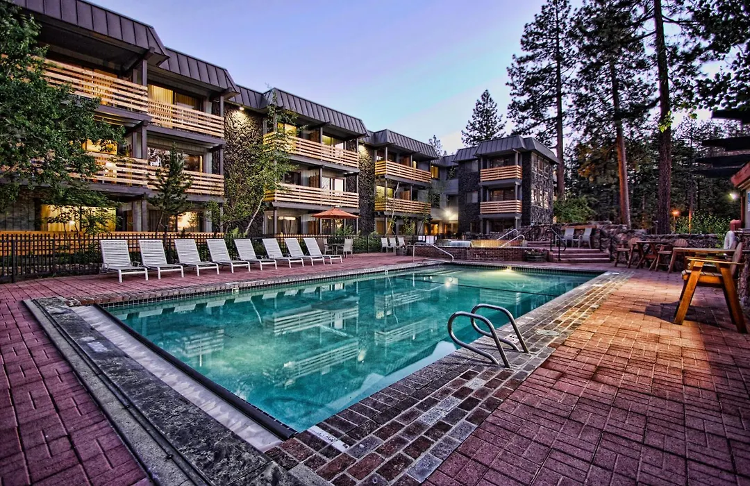 Recreational amenities include an outdoor pool with a two-tiered whirlpool and a game room with foosball and air hockey. Guests can also enjoy activities like volleyball, bike trails, and access to the shores of Lake Tahoe.