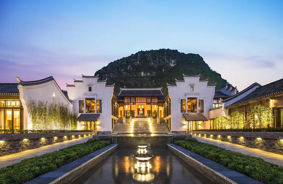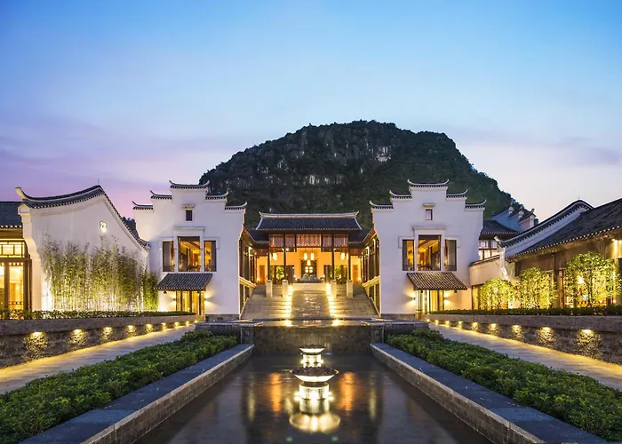 Banyan Tree Yangshuo is a 5-star hotel with a Booking.com rating of 8.9/10, offering 138 spacious villas that highlight stunning views of the Li River and Karst mountains. Amenities include an on-site spa, outdoor swimming pools, and multiple dining venues.