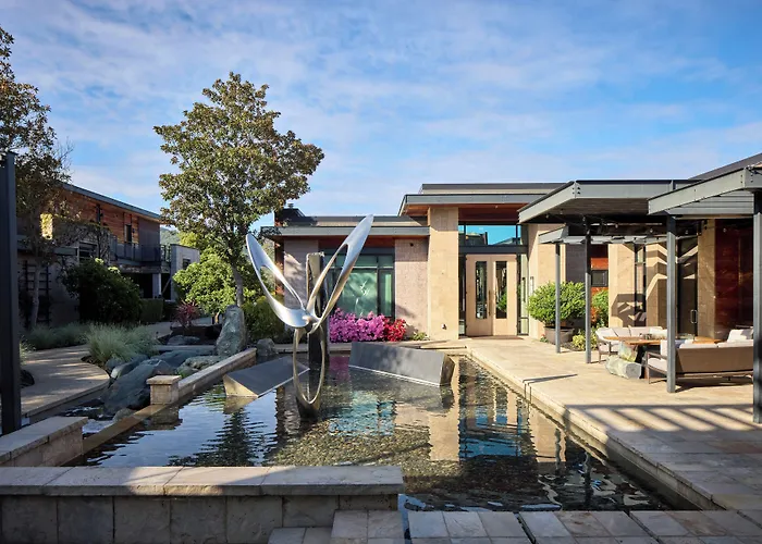 Bardessono Hotel And Spa, a 5-star luxury resort in Yountville, presents sustainable practices combined with elegant accommodations. The LEED Platinum-certified hotel features an on-site restaurant, spa, rooftop pool, and eco-friendly amenities aimed at rejuvenating guests. The hotel's distinctive design incorporates natural elements while providing a tranquil ambiance.