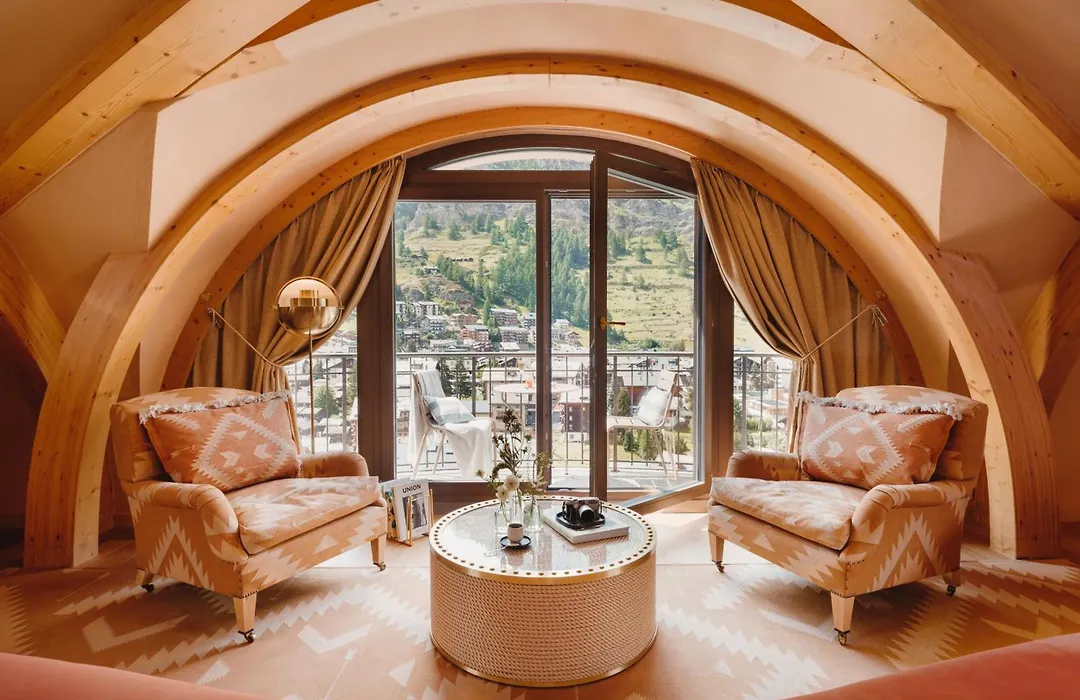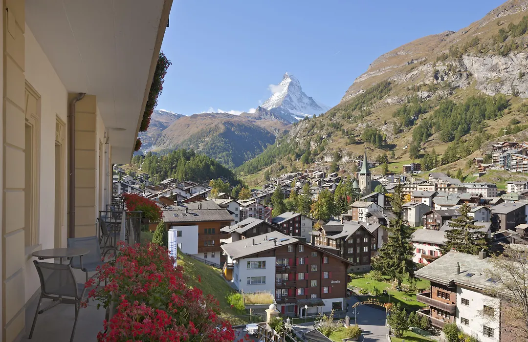 The hotel offers 67 rooms and suites, most featuring direct views of the Matterhorn. Options include single rooms with private balconies and spacious family accommodations with king-size beds and lounges.