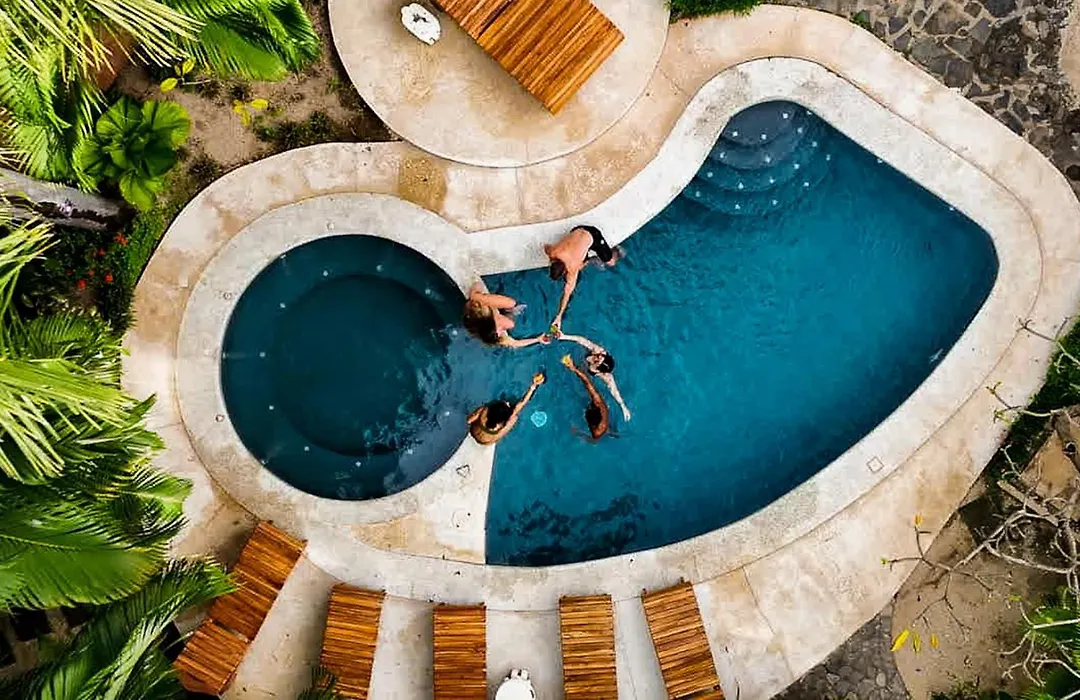 At Rip Jack Inn, rooms include amenities such as air conditioning, ceiling fans, and outdoor patios, some with pool views. The accommodations vary from standard rooms for budget travelers to family suites with kitchenettes, making them suitable for families and groups. The bungalow features an open spa-type shower with smooth river rocks on the bathroom floor.